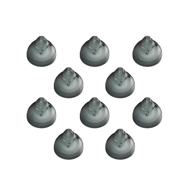 These domes are a dark grey ‘smokey’ colour are made from a comfortable silicon material and feature an integrated wax trap for extended clog up time. They have good retention in the ear and the smokey colour is less prone to discolouration and yellowing.